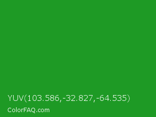 YUV 103.586,-32.827,-64.535 Color is a normal green color and the nearest color is Forest Green #228b22. Hex code #1e9a25 and RGB value is rgb(30,154,37). In RGB color space, this color is composed of 12% red, 60% green, 15% blue, In CMYK color space, this color is composed of 81% cyan, 0% magenta, 76% yellow , 40% black , In HSL color space, this color has a hue angle of 123° , 67% saturation and 36% lightness.