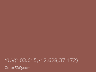 YUV 103.615,-12.628,37.172 Color is a normal red color and the nearest color is Spicy Mix #8b5f4d. Hex code #92574e and RGB value is rgb(146,87,78). In RGB color space, this color is composed of 57% red, 34% green, 31% blue, In CMYK color space, this color is composed of 0% cyan, 40% magenta, 47% yellow , 43% black , In HSL color space, this color has a hue angle of 8° , 30% saturation and 44% lightness.