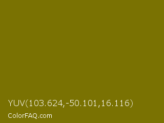 YUV 103.624,-50.101,16.116 Color is a dark yellow color and the nearest color is Bronze Yellow #737000. Hex code #7a7202 and RGB value is rgb(122,114,2). In RGB color space, this color is composed of 48% red, 45% green, 1% blue, In CMYK color space, this color is composed of 0% cyan, 7% magenta, 98% yellow , 52% black , In HSL color space, this color has a hue angle of 56° , 97% saturation and 24% lightness.
