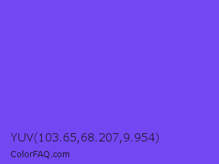 YUV 103.65,68.207,9.954 Color is a light indigo color and the nearest color is Majorelle Blue #6050dc. Hex code #7347f2 and RGB value is rgb(115,71,242). In RGB color space, this color is composed of 45% red, 28% green, 95% blue, In CMYK color space, this color is composed of 52% cyan, 71% magenta, 0% yellow , 5% black , In HSL color space, this color has a hue angle of 255° , 87% saturation and 61% lightness.