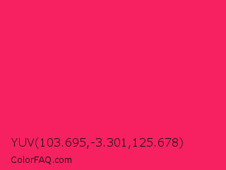 YUV 103.695,-3.301,125.678 Color is a normal rose color and the nearest color is Awesome #ff2052. Hex code #f72061 and RGB value is rgb(247,32,97). In RGB color space, this color is composed of 97% red, 13% green, 38% blue, In CMYK color space, this color is composed of 0% cyan, 87% magenta, 61% yellow , 3% black , In HSL color space, this color has a hue angle of 342° , 93% saturation and 55% lightness.