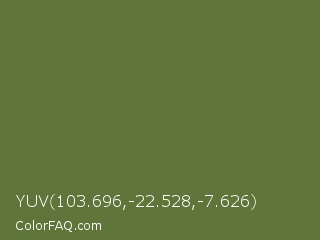 YUV 103.696,-22.528,-7.626 Color is a normal green color and the nearest color is Dingley #5d7747. Hex code #5f753a and RGB value is rgb(95,117,58). In RGB color space, this color is composed of 37% red, 46% green, 23% blue, In CMYK color space, this color is composed of 19% cyan, 0% magenta, 50% yellow , 54% black , In HSL color space, this color has a hue angle of 82° , 34% saturation and 34% lightness.