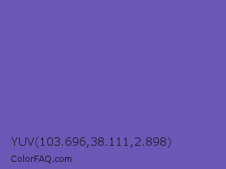 YUV 103.696,38.111,2.898 Color is a normal indigo color and the nearest color is Blue Violet #6456b7. Hex code #6b57b5 and RGB value is rgb(107,87,181). In RGB color space, this color is composed of 42% red, 34% green, 71% blue, In CMYK color space, this color is composed of 41% cyan, 52% magenta, 0% yellow , 29% black , In HSL color space, this color has a hue angle of 253° , 39% saturation and 53% lightness.