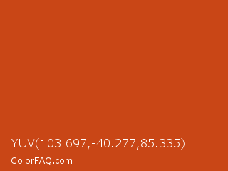 YUV 103.697,-40.277,85.335 Color is a normal orange color and the nearest color is Tia Maria #c1440e. Hex code #c94616 and RGB value is rgb(201,70,22). In RGB color space, this color is composed of 79% red, 27% green, 9% blue, In CMYK color space, this color is composed of 0% cyan, 65% magenta, 89% yellow , 21% black , In HSL color space, this color has a hue angle of 16° , 80% saturation and 44% lightness.