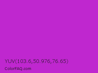 YUV 103.6,50.976,76.65 Color is a normal magenta color and the nearest color is Steel Pink #cc33cc. Hex code #bf27cf and RGB value is rgb(191,39,207). In RGB color space, this color is composed of 75% red, 15% green, 81% blue, In CMYK color space, this color is composed of 8% cyan, 81% magenta, 0% yellow , 19% black , In HSL color space, this color has a hue angle of 294° , 68% saturation and 48% lightness.