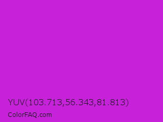 YUV 103.713,56.343,81.813 Color is a normal magenta color and the nearest color is Steel Pink #cc33cc. Hex code #c522da and RGB value is rgb(197,34,218). In RGB color space, this color is composed of 77% red, 13% green, 85% blue, In CMYK color space, this color is composed of 10% cyan, 84% magenta, 0% yellow , 15% black , In HSL color space, this color has a hue angle of 293° , 73% saturation and 49% lightness.