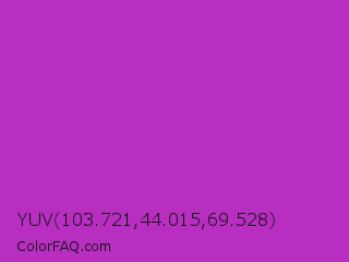 YUV 103.721,44.015,69.528 Color is a normal magenta color and the nearest color is Steel Pink #cc33cc. Hex code #b72ec1 and RGB value is rgb(183,46,193). In RGB color space, this color is composed of 72% red, 18% green, 76% blue, In CMYK color space, this color is composed of 5% cyan, 76% magenta, 0% yellow , 24% black , In HSL color space, this color has a hue angle of 296° , 62% saturation and 47% lightness.