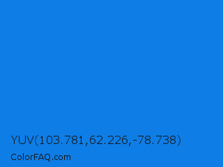 YUV 103.781,62.226,-78.738 Color is a normal blue color and the nearest color is Bright Navy Blue #1974d2. Hex code #0e7de6 and RGB value is rgb(14,125,230). In RGB color space, this color is composed of 5% red, 49% green, 90% blue, In CMYK color space, this color is composed of 94% cyan, 46% magenta, 0% yellow , 10% black , In HSL color space, this color has a hue angle of 209° , 89% saturation and 48% lightness.