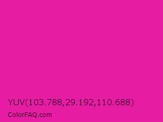 YUV 103.788,29.192,110.688 Color is a normal magenta color and the nearest color is Barbie Pink #e0218a. Hex code #e61ca3 and RGB value is rgb(230,28,163). In RGB color space, this color is composed of 90% red, 11% green, 64% blue, In CMYK color space, this color is composed of 0% cyan, 88% magenta, 29% yellow , 10% black , In HSL color space, this color has a hue angle of 320° , 80% saturation and 51% lightness.