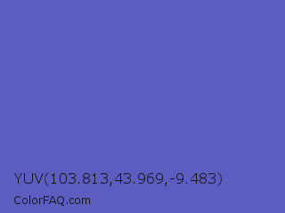 YUV 103.813,43.969,-9.483 Color is a normal indigo color and the nearest color is Blue Violet #6456b7. Hex code #5d5cc1 and RGB value is rgb(93,92,193). In RGB color space, this color is composed of 36% red, 36% green, 76% blue, In CMYK color space, this color is composed of 52% cyan, 52% magenta, 0% yellow , 24% black , In HSL color space, this color has a hue angle of 241° , 45% saturation and 56% lightness.