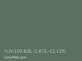 YUV 103.826,-2.872,-12.125 Color is a normal green color and the nearest color is Corduroy #606e68. Hex code #5a7062 and RGB value is rgb(90,112,98). In RGB color space, this color is composed of 35% red, 44% green, 38% blue, In CMYK color space, this color is composed of 20% cyan, 0% magenta, 13% yellow , 56% black , In HSL color space, this color has a hue angle of 142° , 11% saturation and 40% lightness.