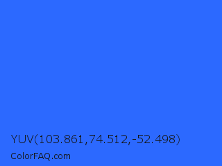 YUV 103.861,74.512,-52.498 Color is a normal blue color and the nearest color is Blue Crayola #1f75fe. Hex code #2c69ff and RGB value is rgb(44,105,255). In RGB color space, this color is composed of 17% red, 41% green, 100% blue, In CMYK color space, this color is composed of 83% cyan, 59% magenta, 0% yellow , 0% black , In HSL color space, this color has a hue angle of 223° , 100% saturation and 59% lightness.