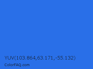 YUV 103.864,63.171,-55.132 Color is a normal blue color and the nearest color is Blue Crayola #1f75fe. Hex code #296fe8 and RGB value is rgb(41,111,232). In RGB color space, this color is composed of 16% red, 44% green, 91% blue, In CMYK color space, this color is composed of 82% cyan, 52% magenta, 0% yellow , 9% black , In HSL color space, this color has a hue angle of 218° , 81% saturation and 54% lightness.