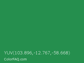 YUV 103.896,-12.767,-58.668 Color is a normal green color and the nearest color is Sea Green #2e8b57. Hex code #258f4e and RGB value is rgb(37,143,78). In RGB color space, this color is composed of 15% red, 56% green, 31% blue, In CMYK color space, this color is composed of 74% cyan, 0% magenta, 45% yellow , 44% black , In HSL color space, this color has a hue angle of 143° , 59% saturation and 35% lightness.