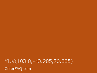 YUV 103.8,-43.285,70.335 Color is a normal orange color and the nearest color is Fiery Orange #b35213. Hex code #b85010 and RGB value is rgb(184,80,16). In RGB color space, this color is composed of 72% red, 31% green, 6% blue, In CMYK color space, this color is composed of 0% cyan, 57% magenta, 91% yellow , 28% black , In HSL color space, this color has a hue angle of 23° , 84% saturation and 39% lightness.