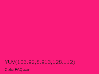 YUV 103.92,8.913,128.112 Color is a normal rose color and the nearest color is Fluorescent Pink #ff1493. Hex code #fa1a7a and RGB value is rgb(250,26,122). In RGB color space, this color is composed of 98% red, 10% green, 48% blue, In CMYK color space, this color is composed of 0% cyan, 90% magenta, 51% yellow , 2% black , In HSL color space, this color has a hue angle of 334° , 96% saturation and 54% lightness.
