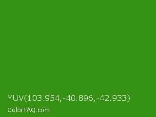 YUV 103.954,-40.896,-42.933 Color is a normal green color and the nearest color is La Palma #368716. Hex code #379115 and RGB value is rgb(55,145,21). In RGB color space, this color is composed of 22% red, 57% green, 8% blue, In CMYK color space, this color is composed of 62% cyan, 0% magenta, 86% yellow , 43% black , In HSL color space, this color has a hue angle of 104° , 75% saturation and 33% lightness.