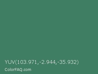 YUV 103.971,-2.944,-35.932 Color is a normal green color and the nearest color is Viridian #40826d. Hex code #3f7e62 and RGB value is rgb(63,126,98). In RGB color space, this color is composed of 25% red, 49% green, 38% blue, In CMYK color space, this color is composed of 50% cyan, 0% magenta, 22% yellow , 51% black , In HSL color space, this color has a hue angle of 153° , 33% saturation and 37% lightness.