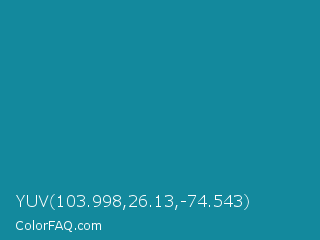 YUV 103.998,26.13,-74.543 Color is a normal cyan color and the nearest color is Blue Chill #0c8990. Hex code #13899d and RGB value is rgb(19,137,157). In RGB color space, this color is composed of 7% red, 54% green, 62% blue, In CMYK color space, this color is composed of 88% cyan, 13% magenta, 0% yellow , 38% black , In HSL color space, this color has a hue angle of 189° , 78% saturation and 35% lightness.