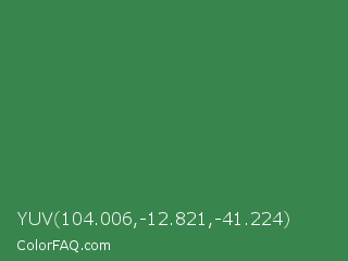 YUV 104.006,-12.821,-41.224 Color is a normal green color and the nearest color is Goblin #3d7d52. Hex code #39854e and RGB value is rgb(57,133,78). In RGB color space, this color is composed of 22% red, 52% green, 31% blue, In CMYK color space, this color is composed of 57% cyan, 0% magenta, 41% yellow , 48% black , In HSL color space, this color has a hue angle of 137° , 40% saturation and 37% lightness.