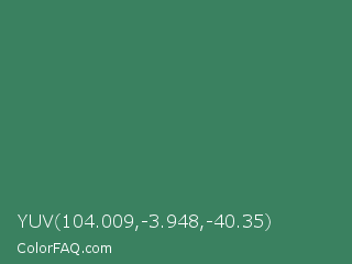 YUV 104.009,-3.948,-40.35 Color is a normal green color and the nearest color is Amazon #3b7a57. Hex code #3a8160 and RGB value is rgb(58,129,96). In RGB color space, this color is composed of 23% red, 51% green, 38% blue, In CMYK color space, this color is composed of 55% cyan, 0% magenta, 26% yellow , 49% black , In HSL color space, this color has a hue angle of 152° , 38% saturation and 37% lightness.