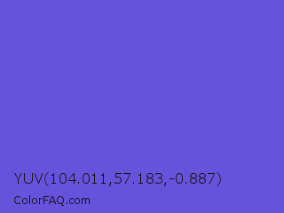 YUV 104.011,57.183,-0.887 Color is a normal indigo color and the nearest color is Majorelle Blue #6050dc. Hex code #6752dc and RGB value is rgb(103,82,220). In RGB color space, this color is composed of 40% red, 32% green, 86% blue, In CMYK color space, this color is composed of 53% cyan, 63% magenta, 0% yellow , 14% black , In HSL color space, this color has a hue angle of 249° , 66% saturation and 59% lightness.