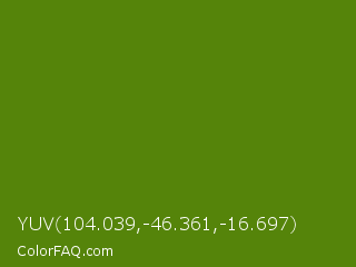 YUV 104.039,-46.361,-16.697 Color is a dark green color and the nearest color is Avocado #568203. Hex code #55840a and RGB value is rgb(85,132,10). In RGB color space, this color is composed of 33% red, 52% green, 4% blue, In CMYK color space, this color is composed of 36% cyan, 0% magenta, 92% yellow , 48% black , In HSL color space, this color has a hue angle of 83° , 86% saturation and 28% lightness.
