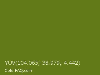 YUV 104.065,-38.979,-4.442 Color is a dark lime color and the nearest color is Fern Frond #657220. Hex code #637a19 and RGB value is rgb(99,122,25). In RGB color space, this color is composed of 39% red, 48% green, 10% blue, In CMYK color space, this color is composed of 19% cyan, 0% magenta, 80% yellow , 52% black , In HSL color space, this color has a hue angle of 74° , 66% saturation and 29% lightness.