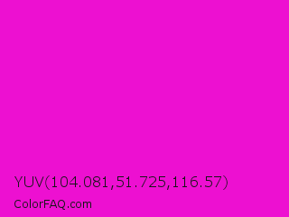 YUV 104.081,51.725,116.57 Color is a normal magenta color and the nearest color is Hot Magenta #ff1dce. Hex code #ed10d1 and RGB value is rgb(237,16,209). In RGB color space, this color is composed of 93% red, 6% green, 82% blue, In CMYK color space, this color is composed of 0% cyan, 93% magenta, 12% yellow , 7% black , In HSL color space, this color has a hue angle of 308° , 87% saturation and 50% lightness.