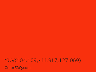 YUV 104.109,-44.917,127.069 Color is a normal red color and the nearest color is Red RYB #fe2712. Hex code #f9300d and RGB value is rgb(249,48,13). In RGB color space, this color is composed of 98% red, 19% green, 5% blue, In CMYK color space, this color is composed of 0% cyan, 81% magenta, 95% yellow , 2% black , In HSL color space, this color has a hue angle of 9° , 95% saturation and 51% lightness.