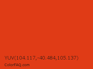 YUV 104.117,-40.484,105.137 Color is a normal red color and the nearest color is Vermilion #d9381e. Hex code #e03b16 and RGB value is rgb(224,59,22). In RGB color space, this color is composed of 88% red, 23% green, 9% blue, In CMYK color space, this color is composed of 0% cyan, 74% magenta, 90% yellow , 12% black , In HSL color space, this color has a hue angle of 11° , 82% saturation and 48% lightness.