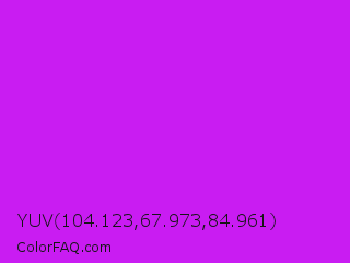 YUV 104.123,67.973,84.961 Color is a normal purple color and the nearest color is Vivid Mulberry #b80ce3. Hex code #c91cf2 and RGB value is rgb(201,28,242). In RGB color space, this color is composed of 79% red, 11% green, 95% blue, In CMYK color space, this color is composed of 17% cyan, 88% magenta, 0% yellow , 5% black , In HSL color space, this color has a hue angle of 289° , 89% saturation and 53% lightness.
