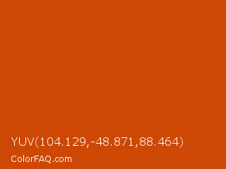 YUV 104.129,-48.871,88.464 Color is a normal orange color and the nearest color is Sinopia #cb410b. Hex code #cd4805 and RGB value is rgb(205,72,5). In RGB color space, this color is composed of 80% red, 28% green, 2% blue, In CMYK color space, this color is composed of 0% cyan, 65% magenta, 98% yellow , 20% black , In HSL color space, this color has a hue angle of 20° , 95% saturation and 41% lightness.
