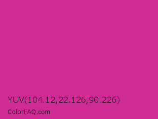 YUV 104.12,22.126,90.226 Color is a normal magenta color and the nearest color is Royal Fuchsia #ca2c92. Hex code #cf2b95 and RGB value is rgb(207,43,149). In RGB color space, this color is composed of 81% red, 17% green, 58% blue, In CMYK color space, this color is composed of 0% cyan, 79% magenta, 28% yellow , 19% black , In HSL color space, this color has a hue angle of 321° , 66% saturation and 49% lightness.
