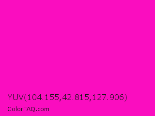 YUV 104.155,42.815,127.906 Color is a normal magenta color and the nearest color is Shocking Pink #fc0fc0. Hex code #fa0dbf and RGB value is rgb(250,13,191). In RGB color space, this color is composed of 98% red, 5% green, 75% blue, In CMYK color space, this color is composed of 0% cyan, 95% magenta, 24% yellow , 2% black , In HSL color space, this color has a hue angle of 315° , 96% saturation and 52% lightness.