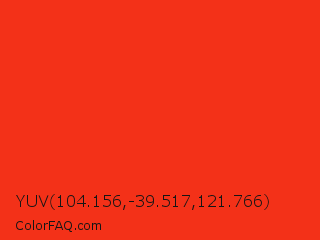 YUV 104.156,-39.517,121.766 Color is a normal red color and the nearest color is Red RYB #fe2712. Hex code #f33118 and RGB value is rgb(243,49,24). In RGB color space, this color is composed of 95% red, 19% green, 9% blue, In CMYK color space, this color is composed of 0% cyan, 80% magenta, 90% yellow , 5% black , In HSL color space, this color has a hue angle of 7° , 90% saturation and 52% lightness.