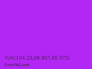 YUV 104.23,68.907,65.573 Color is a normal purple color and the nearest color is Veronica #a020f0. Hex code #b327f4 and RGB value is rgb(179,39,244). In RGB color space, this color is composed of 70% red, 15% green, 96% blue, In CMYK color space, this color is composed of 27% cyan, 84% magenta, 0% yellow , 4% black , In HSL color space, this color has a hue angle of 281° , 90% saturation and 55% lightness.