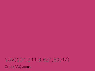 YUV 104.244,3.824,80.47 Color is a normal rose color and the nearest color is Fuchsia Rose #c74375. Hex code #c43870 and RGB value is rgb(196,56,112). In RGB color space, this color is composed of 77% red, 22% green, 44% blue, In CMYK color space, this color is composed of 0% cyan, 71% magenta, 43% yellow , 23% black , In HSL color space, this color has a hue angle of 336° , 56% saturation and 49% lightness.