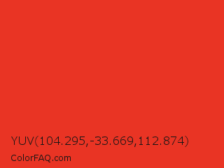YUV 104.295,-33.669,112.874 Color is a normal red color and the nearest color is Permanent Geranium Lake #e12c2c. Hex code #e93424 and RGB value is rgb(233,52,36). In RGB color space, this color is composed of 91% red, 20% green, 14% blue, In CMYK color space, this color is composed of 0% cyan, 78% magenta, 85% yellow , 9% black , In HSL color space, this color has a hue angle of 5° , 82% saturation and 53% lightness.