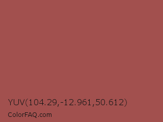 YUV 104.29,-12.961,50.612 Color is a normal red color and the nearest color is Middle Red Purple #a55353. Hex code #a2504e and RGB value is rgb(162,80,78). In RGB color space, this color is composed of 64% red, 31% green, 31% blue, In CMYK color space, this color is composed of 0% cyan, 51% magenta, 52% yellow , 36% black , In HSL color space, this color has a hue angle of 1° , 35% saturation and 47% lightness.