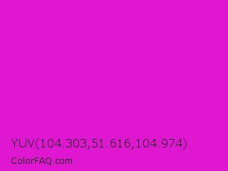 YUV 104.303,51.616,104.974 Color is a normal magenta color and the nearest color is Deep Magenta #cc00cc. Hex code #e017d1 and RGB value is rgb(224,23,209). In RGB color space, this color is composed of 88% red, 9% green, 82% blue, In CMYK color space, this color is composed of 0% cyan, 90% magenta, 7% yellow , 12% black , In HSL color space, this color has a hue angle of 304° , 81% saturation and 48% lightness.