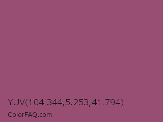 YUV 104.344,5.253,41.794 Color is a normal rose color and the nearest color is Sugar Plum #914e75. Hex code #984e73 and RGB value is rgb(152,78,115). In RGB color space, this color is composed of 60% red, 31% green, 45% blue, In CMYK color space, this color is composed of 0% cyan, 49% magenta, 24% yellow , 40% black , In HSL color space, this color has a hue angle of 330° , 32% saturation and 45% lightness.