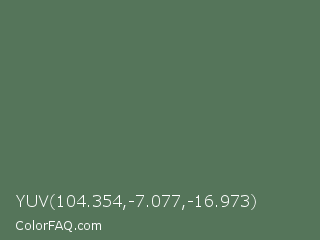 YUV 104.354,-7.077,-16.973 Color is a normal green color and the nearest color is Cactus #587156. Hex code #55755a and RGB value is rgb(85,117,90). In RGB color space, this color is composed of 33% red, 46% green, 35% blue, In CMYK color space, this color is composed of 27% cyan, 0% magenta, 23% yellow , 54% black , In HSL color space, this color has a hue angle of 129° , 16% saturation and 40% lightness.
