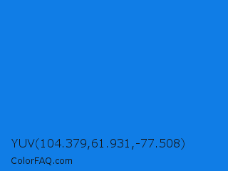 YUV 104.379,61.931,-77.508 Color is a normal blue color and the nearest color is Bright Navy Blue #1974d2. Hex code #107de6 and RGB value is rgb(16,125,230). In RGB color space, this color is composed of 6% red, 49% green, 90% blue, In CMYK color space, this color is composed of 93% cyan, 46% magenta, 0% yellow , 10% black , In HSL color space, this color has a hue angle of 209° , 87% saturation and 48% lightness.