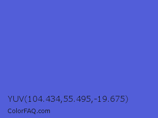 YUV 104.434,55.495,-19.675 Color is a normal blue color and the nearest color is Iris #5a4fcf. Hex code #525ed9 and RGB value is rgb(82,94,217). In RGB color space, this color is composed of 32% red, 37% green, 85% blue, In CMYK color space, this color is composed of 62% cyan, 57% magenta, 0% yellow , 15% black , In HSL color space, this color has a hue angle of 235° , 64% saturation and 59% lightness.