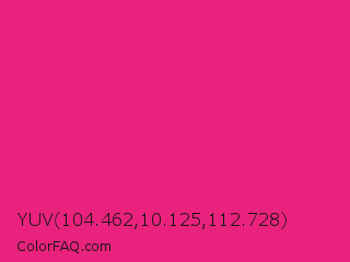 YUV 104.462,10.125,112.728 Color is a normal rose color and the nearest color is Barbie Pink #e0218a. Hex code #e9237d and RGB value is rgb(233,35,125). In RGB color space, this color is composed of 91% red, 14% green, 49% blue, In CMYK color space, this color is composed of 0% cyan, 85% magenta, 46% yellow , 9% black , In HSL color space, this color has a hue angle of 333° , 82% saturation and 53% lightness.