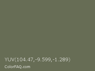 YUV 104.47,-9.599,-1.289 Color is a normal lime color and the nearest color is Siam #646a54. Hex code #676d55 and RGB value is rgb(103,109,85). In RGB color space, this color is composed of 40% red, 43% green, 33% blue, In CMYK color space, this color is composed of 6% cyan, 0% magenta, 22% yellow , 57% black , In HSL color space, this color has a hue angle of 75° , 12% saturation and 38% lightness.