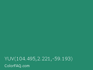 YUV 104.495,2.221,-59.193 Color is a normal green color and the nearest color is Illuminating Emerald #319177. Hex code #258a6d and RGB value is rgb(37,138,109). In RGB color space, this color is composed of 15% red, 54% green, 43% blue, In CMYK color space, this color is composed of 73% cyan, 0% magenta, 21% yellow , 46% black , In HSL color space, this color has a hue angle of 163° , 58% saturation and 34% lightness.