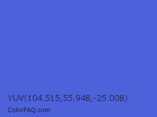 YUV 104.515,55.948,-25.008 Color is a normal blue color and the nearest color is Royal Blue #4169e1. Hex code #4c61da and RGB value is rgb(76,97,218). In RGB color space, this color is composed of 30% red, 38% green, 85% blue, In CMYK color space, this color is composed of 65% cyan, 56% magenta, 0% yellow , 15% black , In HSL color space, this color has a hue angle of 231° , 66% saturation and 58% lightness.
