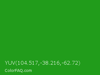 YUV 104.517,-38.216,-62.72 Color is a normal green color and the nearest color is Slimy Green #299617. Hex code #219c1b and RGB value is rgb(33,156,27). In RGB color space, this color is composed of 13% red, 61% green, 11% blue, In CMYK color space, this color is composed of 79% cyan, 0% magenta, 83% yellow , 39% black , In HSL color space, this color has a hue angle of 117° , 70% saturation and 36% lightness.